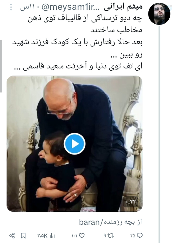 @vala11011011020 July 2025Replying to andمنم #فرزند_شهید م #قالیباف جرأت داره بیاد دیدن من تا به نیابت همه #شهدا بخصوص دوستای قدیمی ش آب دهان نصارش کنم#مادر م ( #همسر_شهید ) که هر روز #نفرین ش میکننابلاغ نکردن #قانون_حجابدروغ گفتن به مستقلین مجلس درانتخاباتدفاع از #مذاکره ای که رهبر گفتن #غیر_شرافتمندانه است#وفاق با نفاق#فرزندان ش...