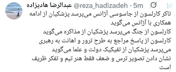 📸🚨🔺نشان دادن تصویر ترس و ضعف فقط هنر تیم و تفکر ظریف است🔺کارلسون از جاسوسی آژانس میپرسد، پزشکیان از ادامه همکاری با آژانس میگوید؛ از جنگ میپرسد، پزشکیان از مذاکره میگوید؛ از پاسخ مراجع به طرح ترور و اهانت به رهبری میپرسد، پزشکیان از تفکیک دولت و علما میگوید!