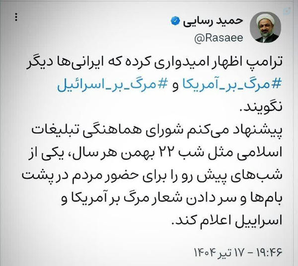 پیشنهاد حمید رسایی به شورای تبلیغات اسلامی در پاسخ به اظهار امیدواری ترامپ