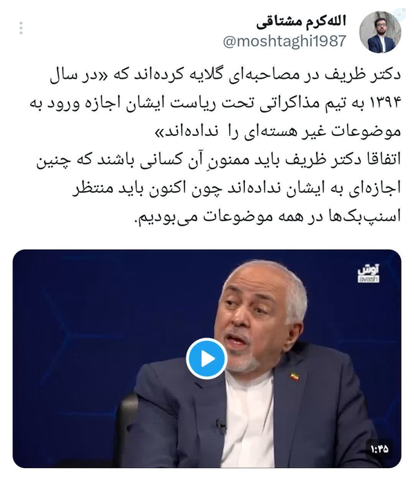❌ خداوند جمهوری اسلامی را ببخشاید که اینقدرررررر به جناب ظریف ظلم کرده!خیلی بدهکاریم به ایشان؛⁉️مثلا اینکه نظام به جای پاسداشت خدمات جاسوسان تیم #مذاکره، آنها را دستگیر و محاکمه کرده، آیا ظلم نیست؟یا اینکه اجازه نداده در غیرهستهای هم برایمان #خسارت_محض به بار آورد