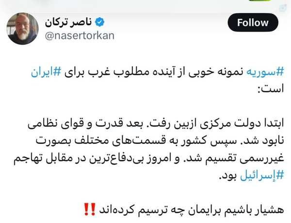 🔴سوریه نمونه خوبی از آینده مطلوب غرب برای ایران است:ابتدا دولت مرکزی ازبین رفت. بعد قدرت و قوای نظامی نابود شد. سپس کشور به قسمتهای مختلف بصورت غیررسمی تقسیم شد. و امروز بیدفاعترین در مقابل تهاجم #إسرائيل بود.🔹هشیار باشیم برایمان چه ترسیم کردهاند