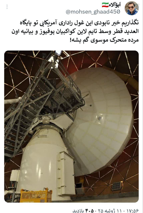 :نگذاریم خبر نابودی این غول راداری آمریکایی تو پایگاه العدید قطر وسط تایم لاین کواکبیان پوفیوز و بیانیه اون مرده متحرک موسوی گم بشه!