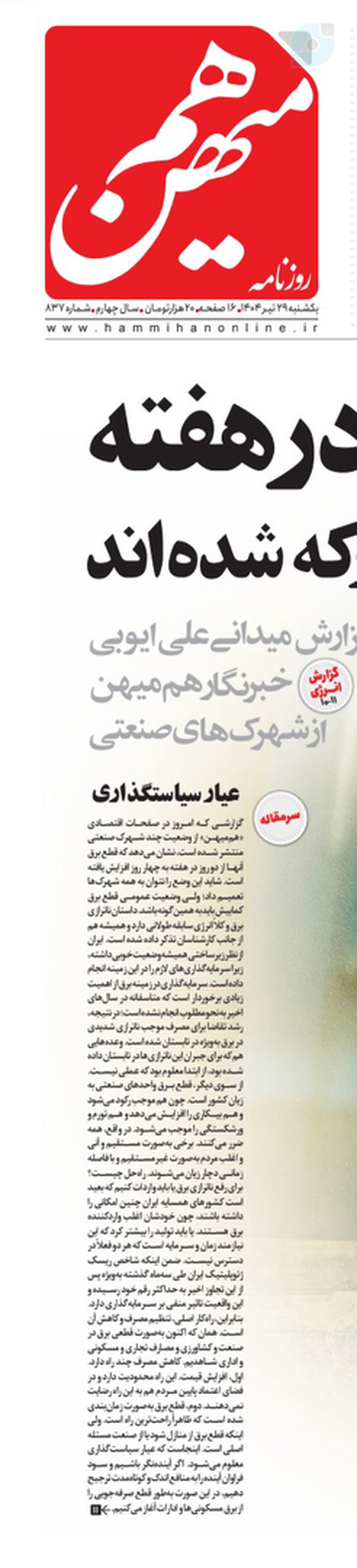 @Management_Academi20 July 2025و اما پاسخ این روزنامه اصلاح طلبان:روزنامه هممیهن در مطلب اخیر خود، با اشاره به قطع برق صنایع بزرگ همچون فولاد، پتروشیمی و سیمان، این اقدام را ناشی از «فقدان اعتماد متقابل» دانسته و آن را به نوعی «امتیاز مقطعی به مردم از جیب آینده» تعبیر کرده است.