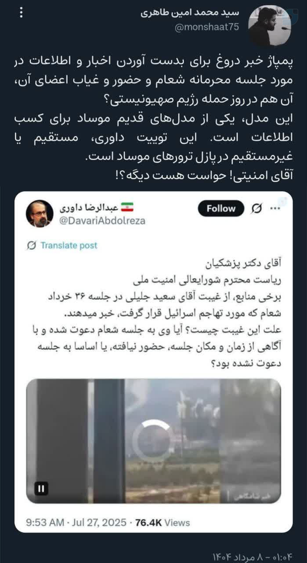 امید شمسآذر@Shahsawar30 July 2025Replying to @Miladseyfollahiyan5688ممنون از اطلاعرسانیتون!01020