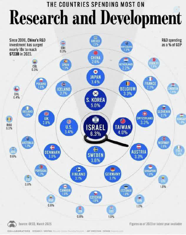 نبردهای تمدنی فعلی، فناوریپایه است. ✍ در سالهای اخیر، عملیاتهای ترور و نفوذ اطلاعاتی رژیم صهیونیستی ضربات سنگینی به جبهه مقاومت وارد کرده است. اما چگونه؟ 🧐به این تصویر نگاه کنید. رژیم صهیونیستی برتریاش را از «تحقیق و توسعه» و «نیروی انسانی متخصص» به دست آورده است.