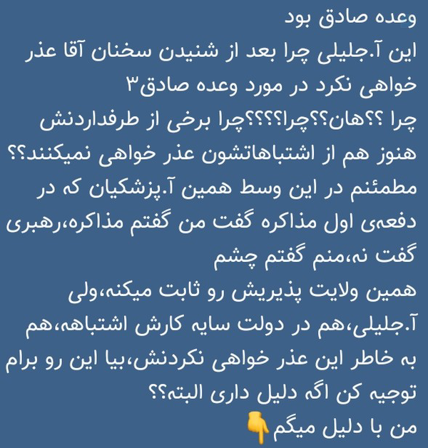 @Morteza8218157 July 2025Replying to and 19 othersمگه بحث من اصلا روی اینجور چیزها بود؟؟شما عقل که داری،برو نگاه شاخصه های آقابرا حاج باقر بیشتره یا آ.جلیلیبعدشم اینقدر از این سندها(نه همهی اینها که گفتی)دوستان برات آوردن که دیگه لازم به سخنان بنده نیست.برو پیشینهی جلیلی رو برا انتخابات رو کن،ثابتی رو همچنینبحث ما روی مذاکرات و جنگ و