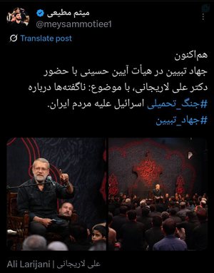 تو زمانی که دشمن به کشور ما حمله کرده؛و شاید دوباره حمله کند؛و الحمدلله بین مردم اتحاد خوبی هست،یکی مثل موسوی و اصلاح طلبان،با بیانه و حرف هاشون دنبال اختلاف افکنی هستند؛و انقلابی هایی مثل مطیعی،با دعوت از لاریجانی دنبال اتحادحالا ببینید کدام تفکر به فکر ملت ایران هست؛و کدام تفکر دنبال آشوب در کشور