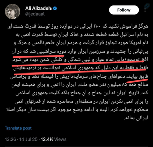 @MJ_Khodaparast15 July 2025Replying to andدوست گرامی علیزاده فوقش یک تحلیل گر در لندن باشد که نهایتا مهره خارجی باشد،تهش اینه دیگه،ظریف در قلب نظام و رئیس جمهور در سایه آقای پزشکیان است و عامل بدبختی ده سال اخیر ملت ایران،اگر بر اساس مکانیزم ماشه دوباره به ایران حمله شد تقصیر علیزاده است یا ظریف؟علیزاده را بلاک کن و خواهان محاکمه ظریف باش