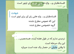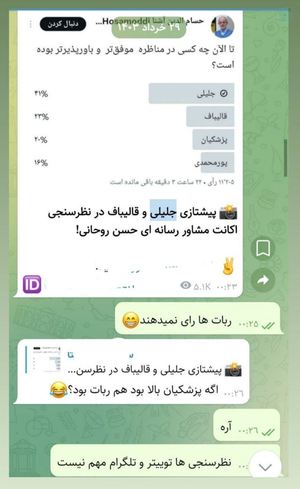 دونمونه از چت های ایام انتخابات؛ من بارها به دوستان گفتم جلیلی رای نمیاره ولی برای اینکه یکبار برای همه اتمام حجت شود گفتیم باید همه حمایت کنیم تا بدانید جلوی ضعیفترین گزینه ی اصلاح طلبان هم میبازید. مردم دیگر از اصلاح طلبان هم خسته اند چه رسد تفکرات افراطی و دگم. یاعلی...