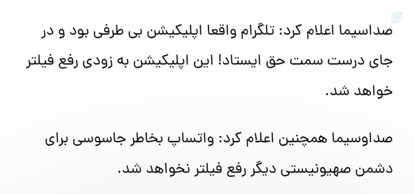 خبر رفع فیلتر تلگرام از قول صداوسیما دست به دست میشه.معمولا خبرهایی که نمی گه کدوم شبکه، کدوم برنامه، چه کسی این حرف رو زده دروغ هستند.ضمنا دوستان فراموش کردند که تلگرام در فتنه ۹۶ و ۹۸ کجا بود و چه بلایی سر افکار عمومی ایران آورد؟