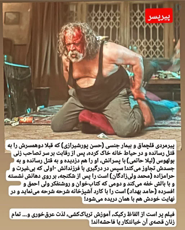 فیلم پیرپسر را در سینما دیدم. برخی از تماشاگران حاضر در سینما هم اعتراض داشتند. توضیح دادم که چون قرار است در کمیسیون فرهنگی موضوع بررسی شود، به اینجا آمدهام.شرح آنچه در این تصویر نوشته شده، دقیق است. مهمترین هدف فیلم، زدن ولایت پدر و مفهوم خانواده است. پرونده فیلم جهت بررسی به کمیسیون آورده شده.
