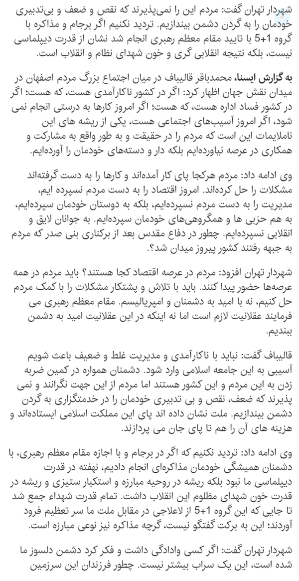 اسرائیل درزمان #ریسقوهمجریه:پزشکیان#ریسقوهمقننه:قالیباف به ایران حمله کرد.زمانی که قالیباف گفت:برجام نتیجه انقلابی گری وخون شهدااست.جناب قالیباف بایدبه اندازه ظریف تمام قد پاسخگو باشی.دیگرکسی حق ندارداز #رهبری استفاده کلامی کند.#ملتپشتایرانورهبر ماندند فقط بخاطر #ایرانورهبری#بازنشر
