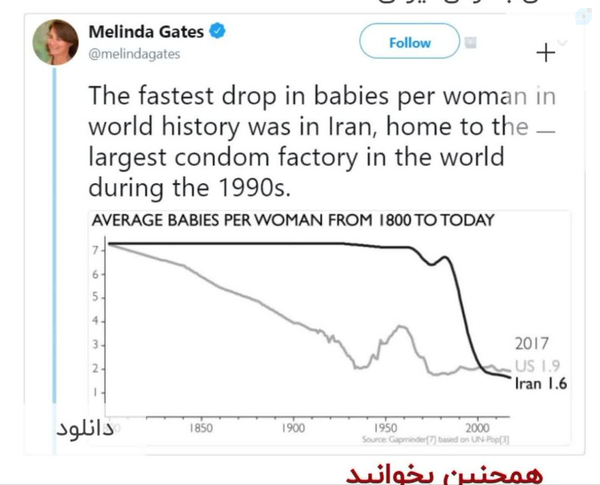 🔴اسراییل خیلی وقت است کشتار ما را شروع کرده است در جنگ دوازده روزه صدای وحشی گریهایش را شنیدیم...▪️بیل گیتس و همسرش را خوب می شناسید، پروژه کنترل جمعیت جهان توسط یهودها را دنبال میکنند؛ سال ۹۷ همسر بیل گیتس اعلام کرد که زنان ایران در دنیا، رتبه اول سریعترین کاهش نرخ فرزند آوری را دارند!