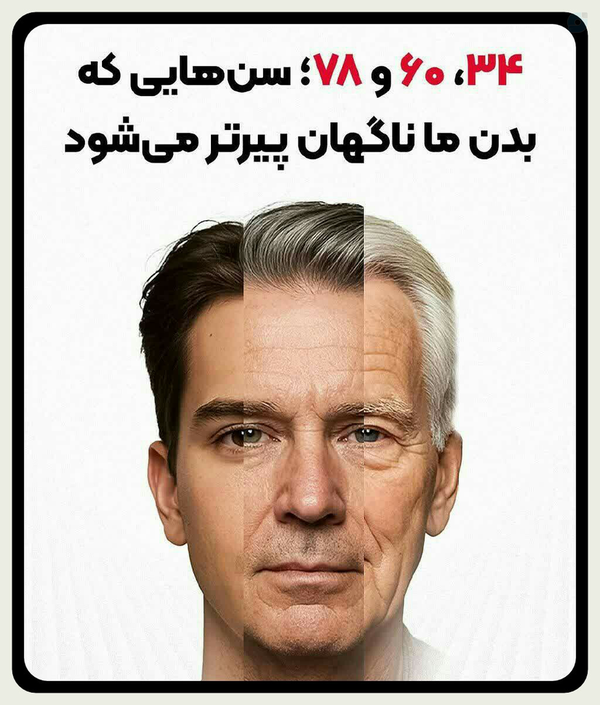 سلام و ادب و احترام. تحقیقات نشون داده که در این سنین، بدن ممکنه تغییرات سریعتری رو نشان بده که به عنوان "سنهای پیری ناگهانی" شناخته میشن( اواسط دهه 40 و اوایل دهه 60) این تغییرات شامل کاهش عملکرد سیستم قلبی عروقی، تحلیل توان عضلانی، کاهش تراکم استخوان و تغییرات هورمونیست.