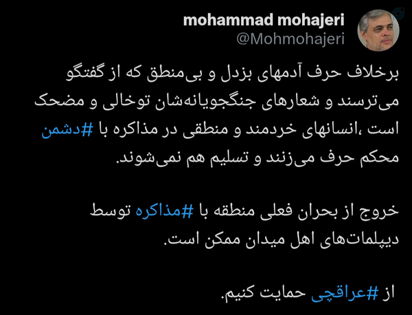 جای خانواده آن هزار شهید جنگ ۱۲روزه بودم از محمد مهاجری و باقی آنها که با تحمیل #مذاکرات_مرگبار مقدمات حمله اسراییل را فراهم کردند شکایت حقوقی میکردم. بدون همدستی این جماعت که برای منافع اقتصادی کارفرماهای الیگارششان کشور را به مذبح مذاکرات بردند آن هزار ایرانی زیر خاک نبودند.