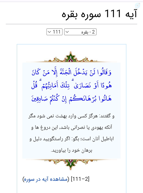 پیام ها1- غرور دينى، باعث شد تا يهوديان و مسيحيان خود را نژاد برتر و بهشت را در انحصار خود بدانند. «إِلَّا مَنْ كانَ هُوداً أَوْ نَصارى»2- امتيازطلبى وخودبرتربينى، آرزويى خام وخيالى واهى است. «تِلْكَ أَمانِيُّهُمْ»3- ادّعاى بدون دليل محكوم است. «قُلْ هاتُوا بُرْهانَكُمْ»