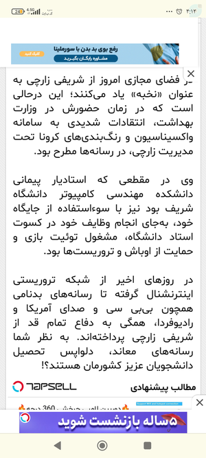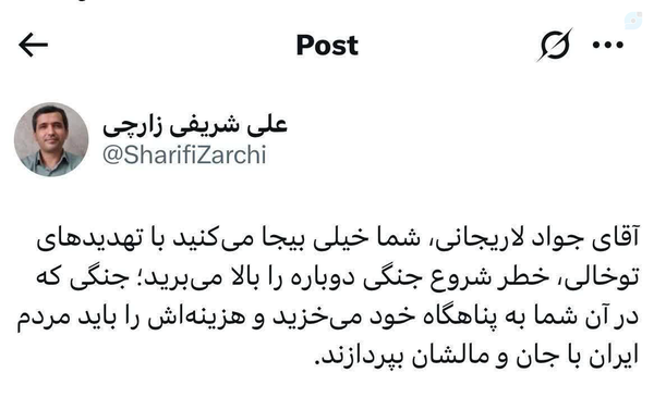 ولایت قضاندارد@user17136946603510 July 2025Replying to @Sheykh_Sarabiاین مثل ظریفه ،جزء اولین کسانی بود که گفت جنگ را متوقف کنید ، قوه قضائیه از چی میترسه که کاری به کار اینا نداره00058