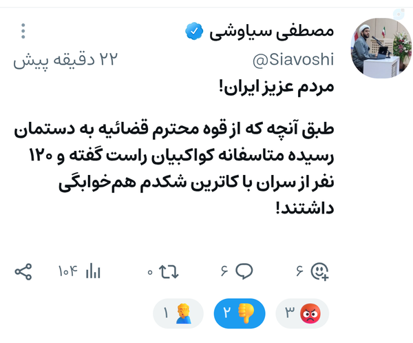 یک نفر از #قوه_قضائیه بیاید روشنگری کند:۱. چرا امثال #کواکبیان میتوانند حرف مفت بزنند و آزاد بگردند؟۲. چرا ظریف و روحانی عاملان تحمیل #مکانیسم_ماشه باید طلبکار باشند نه مجرم؟۳. تکلیف جاسوسان وطنفروش چه شد؟ دوتا اعدام کافی بود؟باز باید بخوریم؟۴. متهمان خسارت کرسنت را چرا محاکمه نمیکنید؟👇