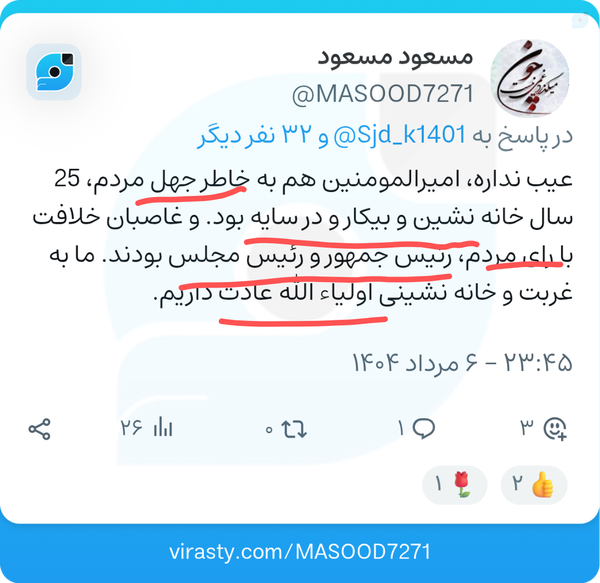در مثل مناقشه نیست من جلیلی رو در مقام عصمت با امیرالمومنین مقایسه نمی کنم بلکه درخصوص اصلحیت برای انتخاب مقایسه می کنم. و این حرف را که ببینید چه کار کردید که رای نیاوردید حرف ابلهانه ای می دونم. با این منطق سست باید دید ائمه چه کار کرده بودند که. معمولا اقبال مردمی نداشتند..