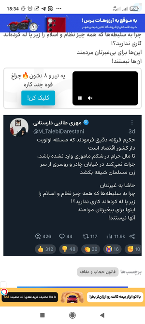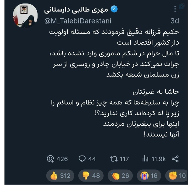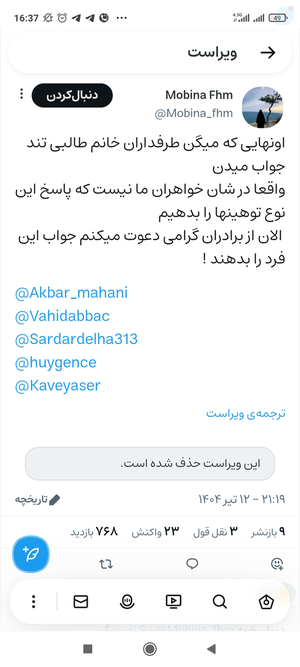 @My_hero13 July 2025Replying toشماها خیلی عجیبید . حتی برا اینکه این خانم رو تبرئه کنید از امام حسین ع مایه میکذارید ! طرف علنا میگه بیغیرتند ، میکه حرام لقمه هستند . عجب !!!! چرا الان تجمع برگزار نمیکنند ؟ مگر به مسیر حق شون ایمان ندارند ؟ همین الان مثل تجمع قبل برگزار کنید ، اگر ایمان دارید روش تون بحقه !!!