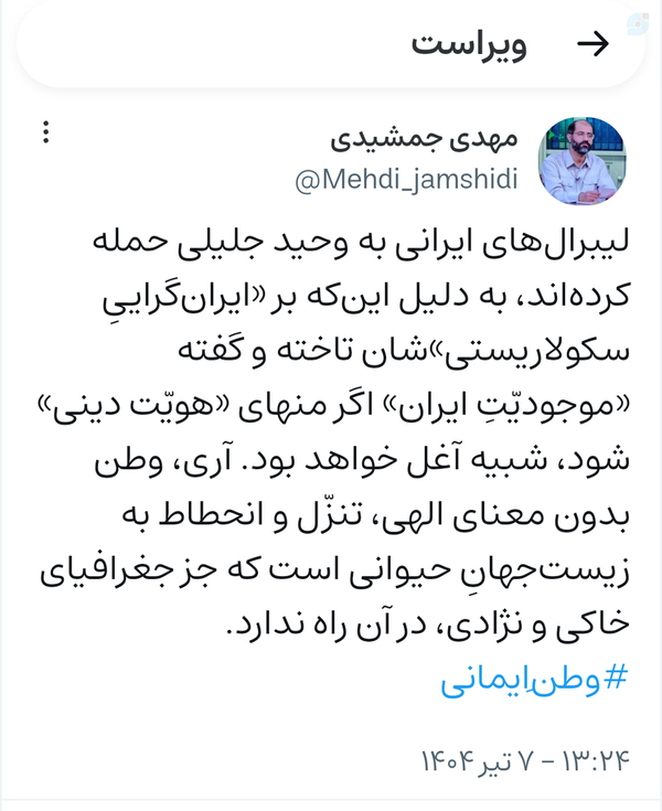 @shahid1209 July 2025Replying to and 21 othersکتاب زیاد خواندن معرفت و فهم نمی آورد به جای همه اون کتابها ،کمی اخلاق و معرفت می آموخت که اینطور به مخالفانش توهین نمیکرد و برای دیگران احترام قائل میشدکمی با منظومه فکری رهبری آشنا میشد و درباره وطن اینطور اظهارنظرنمیکرداینا نمونه کمی از نظرات غلط ایشان هست خیلی بیشتر از اینا ایشان انحراف دارن
