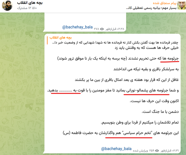 26 June 2025حرام لقمه سیاسی @Bachehay_bala تازه خوبه میخواستی حرف نزنی و این همه فحش دادیمیخواستی فحش بدی چه گندی بالا میاوردی؟ تو الان مثلا دلسوز مملکتی آره جون خودت آره ارواح عمه ترامپ