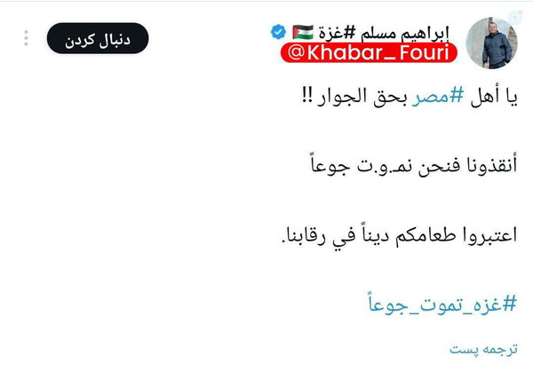 توئیت کاربر #فلسطینی پس از همهگیر شدن قحطی در غزه:ای مردم #مصر به حق همسایگی!!ما را نجات دهید ما از #گرسنگی میمیریم.غذایتان را به عنوان بدهی بر گردن ما در نظر بگیرید.