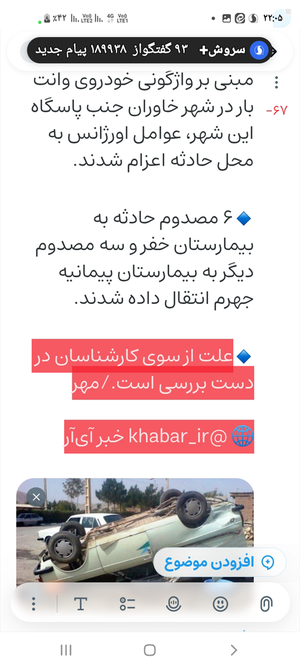 💢 واژگونی وانتبار در جاده خاوران ۹ نفر را مصدوم کردرئیس اورژانس جهرم🔹در تماس با اورژانس ۱۱۵ مبنی بر واژگونی خودروی وانت بار در شهر خاوران جنب پاسگاه این شهر، عوامل اورژانس به محل حادثه اعزام شدند.🔹۶ مصدوم حادثه به بیمارستان خفر و سه مصدوم دیگر به بیمارستان پیمانیه جهرم انتقال داده شدند.
