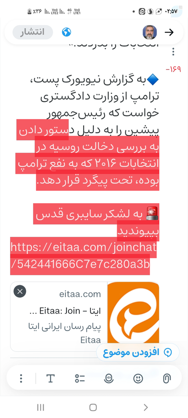 ♦️ترامپ، اوباما را به خیانت متهم کرد🔷دونالد ترامپ میگوید رئیسجمهور پیشین آمریکا باراک اوباما «مجرم» و «خائن» است، چون دستور بررسی دخالت روسیه در انتخابات ۲۰۱۶ را داده و «آنها تلاش کردند انتخابات را بدزدند.»🔷به گزارش نیویورک پست، ترامپ از وزارت دادگستری خواست که رئیسجمهور پیشین را به دلیل