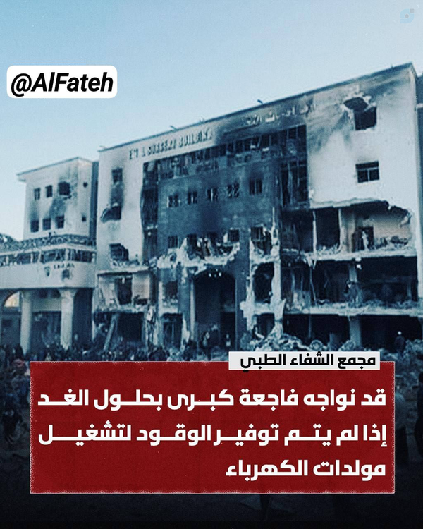 🔴مجمع #الشفاء الطبي: قد نواجه فاجعة كبرى بحلول الغد إذا لم يتم توفير الوقود لتشغيل مولدات الكهرباءمجتمع پزشکی الشفاء: اگر سوخت برای کار ژنراتورها تأمین نشود، ممکن است تا فردا با فاجعه بزرگی روبرو شویم.
