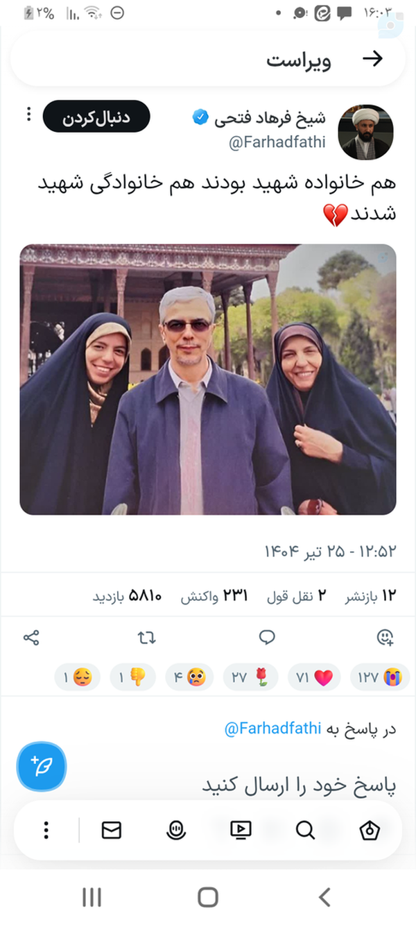 خدا به دادِ دل همسران صبور و دخترانِ باباییِ دیگر شهدا برسد که با دیدن این عکس آه از نهادشان برخواهد خاست که ایکاش ما هم...؟!😭 پ ن: سپهبد باقری که سالها برادر شهید بود، حالا به افتخار همسر شهید، پدر شهید و از همه بالاتر خودِ شهید هم نائل آمد؛ هنیئا لکم🌷@Farhadfathi