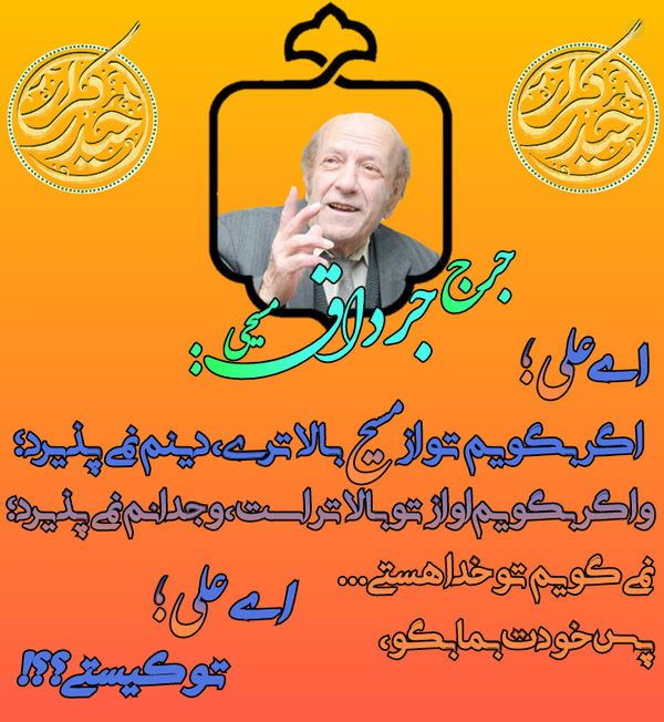 یک نامه هم نوشت و گفت آقای جرد جرداق شما یک حقوقدان و وکیل دادگستری هستی، نه شیعه هستی و نه سنی که بگوییم طرفداری را میکنی، کار تو دفاع از مظلوم است.ما با اهل سنت بر سر علی (علیه السلام) دعوا داریم ما می گوییم حق با علی است آنها می گویند نه!ادامه👇🏻👇🏻