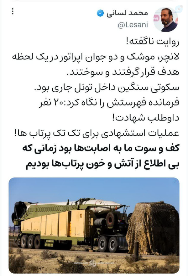 🎥روایت ناگفته!لانچر، موشک و دو جوان اپراتور در یک لحظه هدف قرار گرفتند و سوختند.سکوتی سنگین داخل تونل جاری بود.فرمانده فهرستش را نگاه کرد:۲۰ نفر داوطلب شهادت!عملیات استشهادی برای تک تک پرتاب ها!کف و سوت ما به اصابتها بود زمانی که بی اطلاع از آتش و خون پرتابها بودیم