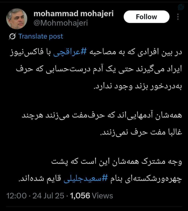ادبیات عضو شورای اطلاع رسانی دولت اصلاحات راببینیدوفاق و وحدت برای این جماعت صرفا یک شعارفریبنده برای ساکت کردن طرفداران نظام استایده ای برای اداره کشور ندارند؛فقط به منتقدین دولت هتاکی میکنندوهمه بی وجودی وبی عرضگی شون در نهایت مقصر دکتر جلیلی است چراکسی بااین جماعت وحدت شکن هتاک برخوردی نمیکند