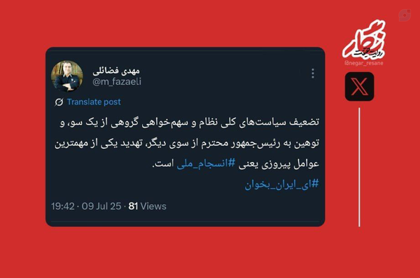 📱 عضو دفتر حفظ و نشر آثار رهبر انقلاب: تضعیف سیاستهای کلی نظام و سهمخواهی گروهی از یک سو، و توهین به رئیسجمهور محترم از سوی دیگر، تهدید یکی از مهمترین عوامل پیروزی یعنی #انسجام_ملی است. 🌷 #ای_ایران بخوان📱 ایتا | بله | ایکس | اینستاگرام | @Negar_Resane