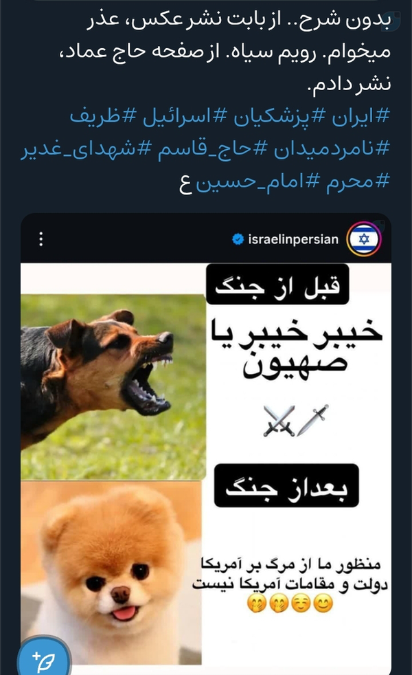 وقتی دشمن در ندانم کاری دوستان نادان، در حال اسکی هستش. اینها، مارو با لیبی و عراق و محمودعباس و کره جنوبی و ژاپن و هند، تشبیه میکنند. کور خوندن و ما یک پرچم، یک رهبر، یک نیروی نظامی، یک مشت واحده، داریم. أَللّهُمَّ ارْزُقْنی شَفاعَةَ الْحُسَیْنِ یَومَ الْوُرُودِ، ان شاءالله. یاعلی.❤🌷🇮🇷🌷❤