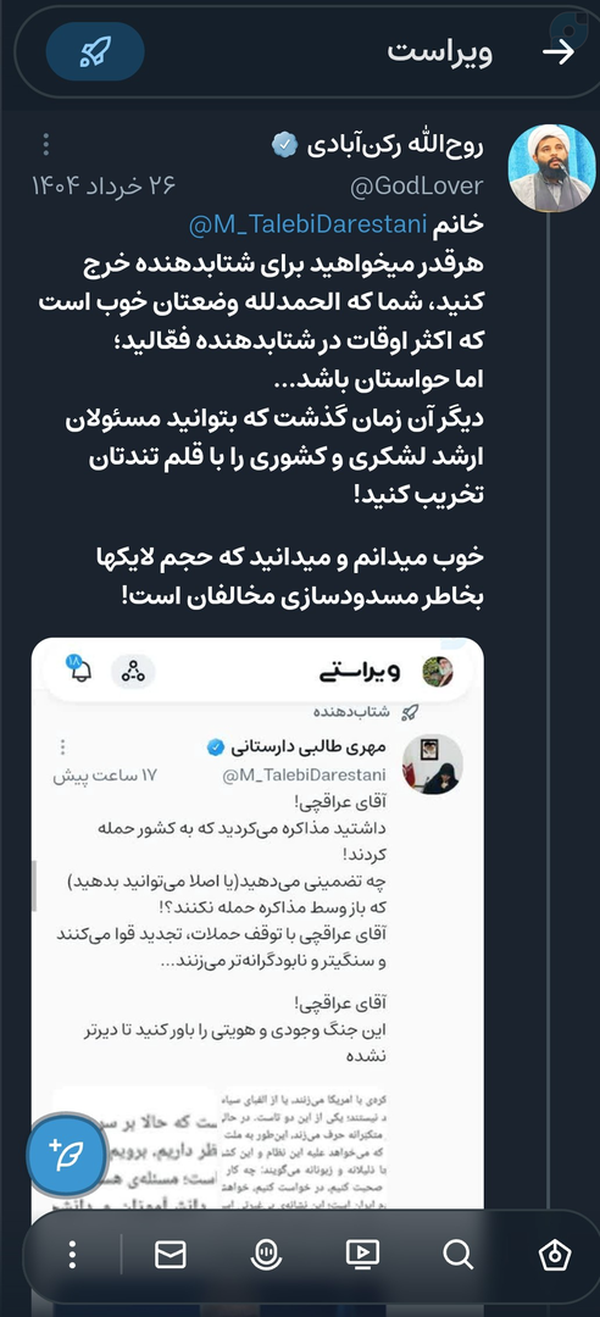 جناب آقای رکن آبادیمیگویم تا شاید حلالیت بطلبید و از دین این بانو خارج شوید؛بنده شخصا قربته الی الله و بدون اطلاع هیچ کس بارها برای ویراست های ایشان و برخی دیگر از کاربران شتابدهنده گرفتم چون وظیفه خود میدانستم پیامهایی شنیده شود. حتما دیگرانی هم هستند که چنین کردند. حلالیت بطلبید@GodLover