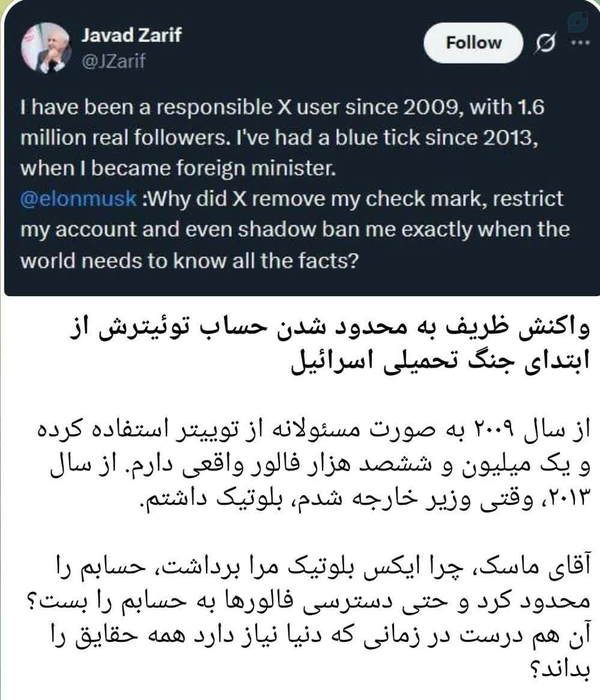 🔵وقتی عده ای دنبال رفع فیلتر توییتر بودند، مصادیق خیانت های توییتر در محدود کردن اکانت های حامی نظام و تقویت جریان ضدنظام در بزنگاه ها رو تذکر میدادیم، ولی اعتنا نمی شد!اما اینبار همگان دیدند در وسط جنگ بسیاری از اکانت ها حتی در سطح جواد ظریف هم محدود شدند!کاش عبرت بگیریم!🗣 احمد کارآمد🔴