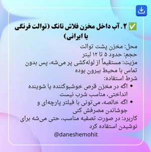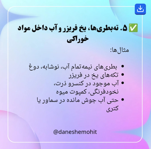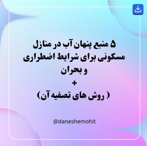 *** منابع اضطراری آب در منازلدر شرایط بحرانی مانند جنگ، زلزله یا قطع طولانیمدت شبکه، دسترسی به آب سالم نقش حیاتی ایفا می کند.اگرچه بدون ذخیرهسازی قبلی، یافتن آب در چنین شرایطی سخت است، اما در هر خانهای، منابع غیربدیهی از آب وجود دارد که میتوانند در مواقع اضطراری مورد استفاده قرار گیرند.#جنگ .در این پست با ۵ منبع آب در منازل آشنا میشوید که در مواقع بحران، میتوانند زندگی شما را نجات دهند:آب موجود در مخزن کولر آبی آب ذخیرهشده در فلاشتانک توالت آب تقطیرشدهی کولر گازی آب باقیمانده در شلنگها و لوازم خانگی یخ موجود در فریزر و مایعات باقیمانده در بطریها و کنسروها