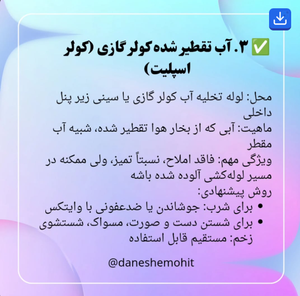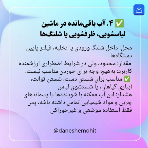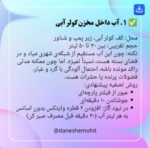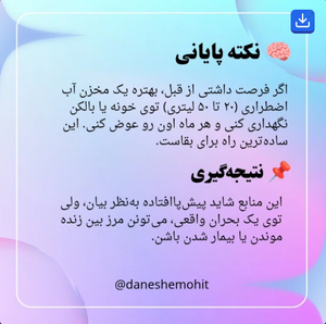 ⚠️ توجه:پیش از مصرف این منابع برای آشامیدن، رعایت نکات بهداشتی مانند جوشاندن آب، عبور از فیلتر پارچهای، یا گندزدایی با محلول هیپوکلریت سدیم (وایتکس بدون اسانس) الزامیست.منبع: daneshemohit