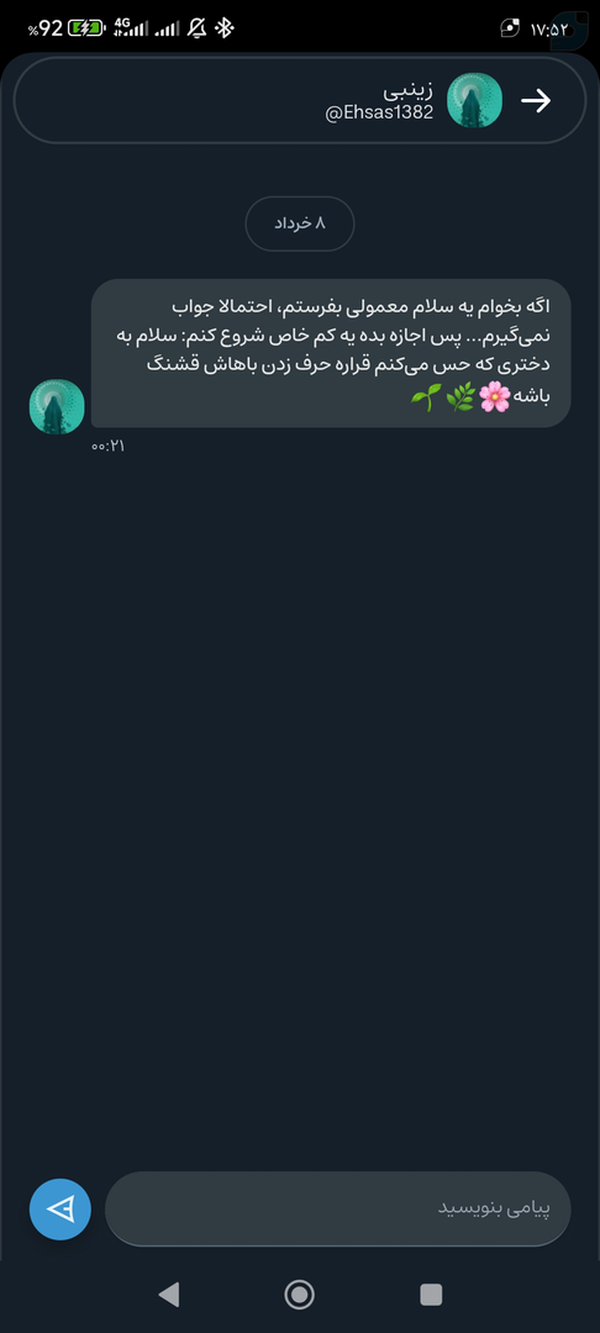 10 June 2025https://virasty.com/Ehsas1382سلام این اکانت پسرهست ومزاحم میشه، گزارش و بلاک کنیدvirasty.comزینبی @Ehsas1382 | virasty