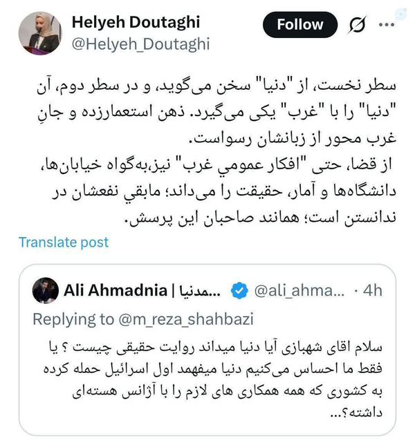 پاسخ دکتر هلیا دوطاقی به علی احمدنیا رییس امور اطلاع رسانی دولت