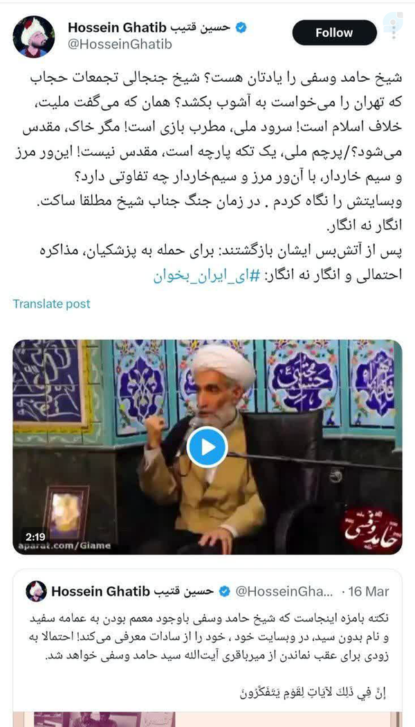 کاربری در این خصوص نوشته:شیخ حامد وفسی را یادتان هست؟ شیخ جنجالی تجمعات حجاب که تهران را میخواست به آشوب بکشد؟ همان که میگفت ملیت، خلاف اسلام است! سرود ملی، مطرب بازی است! مگر خاک، مقدس میشود؟