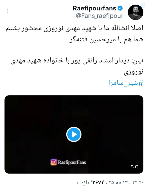 14 May 2025متاسفانه دیروز یه مشت سایبری غربگرا-وفاقی نسبت به شهید مدافع حرم #مهدی_نوروزی بیحرمتی کردند.آقایان وفاقی انقلابی و پادوهای رسانهای ایشان؛ چشمانشان را باز کنند.انتخابات مجلس تمام شد! آخرتتان را هم به باد دادید…