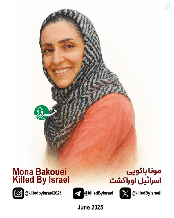 ♦️مونا باکوئی، یک زن پنجاه و چند سالۀ ایرانی بود. او همسر علی باکوئی و مادر یاسمین و آرمین باکوئی بود🔹برای اینکه همسر دانشمندش را ترور کنند، موشکهای اسرائیلی منزل مسکونی آنها را هدف گرفتند. 🔹آتشنشانی که خرابهها را در جستجوی بدنهای آنها زیر و رو کرد، مختار باکوئی برادر مونا بود.