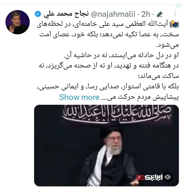 ⭕️آیتالله العظمی سید علی خامنهای، در لحظههای سخت، به عصا تکیه نمیدهد؛ بلکه خود، عصای امت میشود.🔺️او در دل حادثه میایستد، نه در حاشیه آن.در هنگامه فتنه و تهدید، او نه از صحنه میگریزد، نه ساکت میماند؛بلکه با قامتی استوار، صدایی رسا، و ایمانی حسینی، پیشاپیش مردم حرکت میکند.