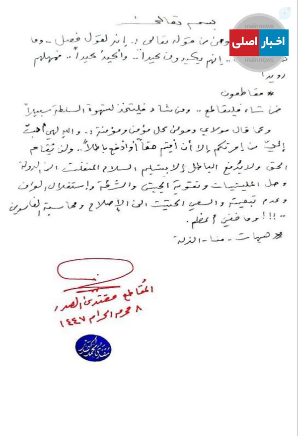 مقتدی صدر خواستار انحلال و خلع سلاح فوری حشدالشعبی شد! 🔹مقتدی صدر، رهبر جریان صدر در عراق، در اظهاراتی تازه خواستار تحویل تمامی سلاحها به دولت عراق و انحلال گروههای شبهنظامی شد.🔹صدر اعلام کرد که باید نهادهای ارتش و پلیس تقویت شوند و تمامی سلاحها تنها در اختیار دولت عراق قرار گیرد.