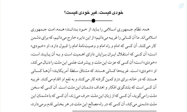 شنیدی بعضیا همش میگن خودی نزن!؟حالا بیاییم ببینیم خودی و غیر خودی در نظر مقام معظم رهبری مدظله العالی کیست؟کتاب زمانه ات را بشناس جلد2 ص108