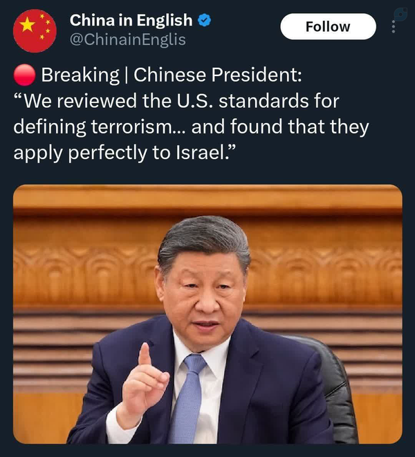 🔸چین: #اسرائیل #تروریست است🔹رئیس جمهور چین: براساس استانداردهای تعریف ایالات متحده از تروریسم را بررسی کردیم... و دریافتیم که آنها کاملاً در مورد اسرائیل صدق میکنند.#مرگ_بر_اسرائیل #مرگ_بر_آمریکا #مرگ_بر_ترامپ #مرگ_بر_نتانیاهو