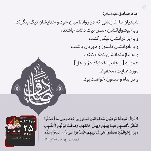 ... لِأَنفُسِهِم فيما بَينَهُم وبَينَ خالِقِهم، وصَحَّت نِيّاتُهُم لِأَئِمَّتِهِم، وبَرّوا إخوانَهُم؛ فَعَطَفوا عَلى ضَعيفِهِم وتَصَدَّقوا عَلى ذَوِي الفاقَةِ مِنهُم.شيعيان ما، تا زمانى كه در روابط ميان خود و خدايشان نيك بنگرند، و به پيشوايانشان حسن نيّت داشته باشند، و به برادرانشان نيكى كنند، ...